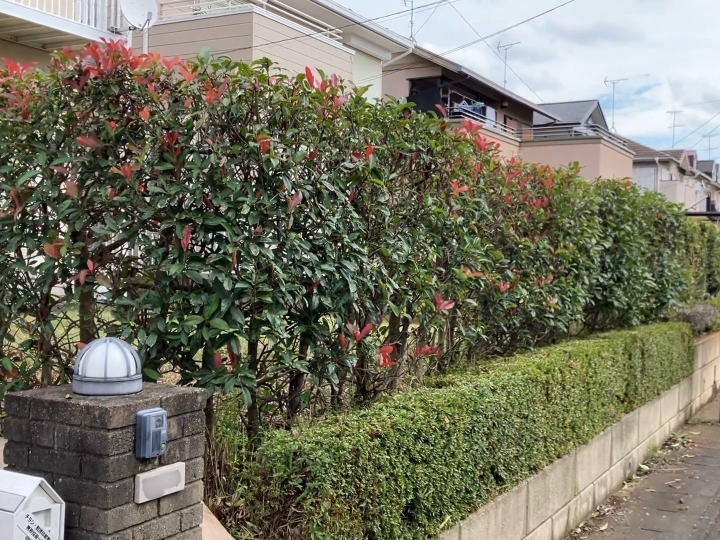 ベニカナメモチの生垣と、その下のイヌツゲの植え込みを、きれいに整え直しました。